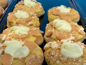 Banana Pudding- A fluffy donut topped with creamy banana icing, finished with a crunchy layer of vanilla wafers, and crowned with a rich dollop of smooth banana pudding in the center.