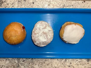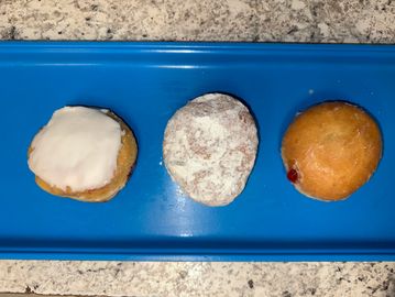 Raspberry Filled – Tart raspberry jam center with your choice of vanilla frosting, powdered sugar, or glaze.
